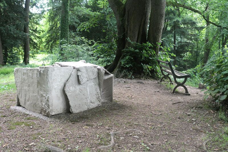 Die Skuptur besteht aus gegossenen Gipsplatten, die im getrockneten Zustand gebrochen wurden. Die Konstruktion hält die zueinander angeordneten Fragmente. Konstruktion und Dekonstruktion liegen eng beisammen. Es geht um Körper und Raum und darum, wie sich der Mensch in die Architektur einfügt, sich Zwischenräume sucht. Das schwere Material und die absichtlich hervorgehobene Brüchigkeit stehen im Gegensatz zueinander. aussichtKUNST, Freiburg DE,