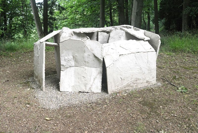 Die Skuptur besteht aus gegossenen Gipsplatten, die im getrockneten Zustand gebrochen wurden. Die Konstruktion hält die zueinander angeordneten Fragmente. Konstruktion und Dekonstruktion liegen eng beisammen. Es geht um Körper und Raum und darum, wie sich der Mensch in die Architektur einfügt, sich Zwischenräume sucht. Das schwere Material und die absichtlich hervorgehobene Brüchigkeit stehen im Gegensatz zueinander. aussichtKUNST, Freiburg DE,