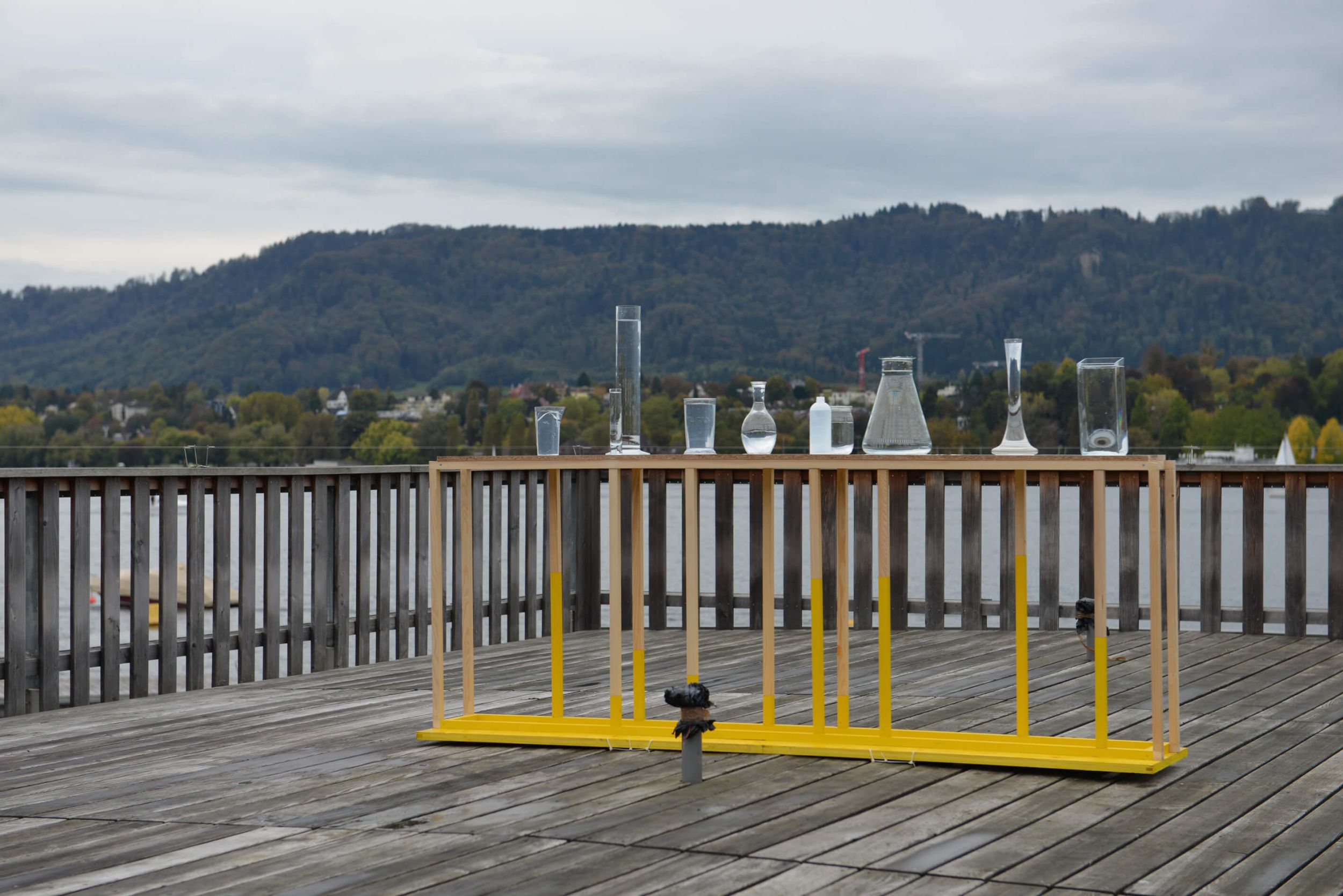 1/Adler und Raschle beschäftigen sich in ihrer Arbeit „Large Eddy Simulation“ mit der Messbarkeit von Turbulenz. Das Seebad Utoquai ist ein ruhiger, beschaulicher Ort, eine Idylle weit weg der „turbulenzen“, die der Ausstellungstitel vorgibt. Die beiden Künstlerinnen nützen diesen Widerspruch. Sie haben ein Objekt entworfen, das eine Versuchsanordnung simuliert um Turbulenzen messen zu können. Adler und Raschle beziehen sich auf diesen Ort, an dem alles unmittelbar dem Wetter ausgeliefert ist und eine unübersichtliche, sich schnell verändernde Situation in sich birgt. Sie eröffnen ein Versuchsfeld für die empfindliche Abhängigkeit von Randbedingungen. Seebad Utoquai, Zürich, in Zusammenarbeit mit Tonjaschja Adler.
