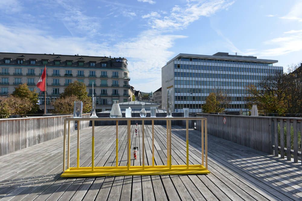1/Adler und Raschle beschäftigen sich in ihrer Arbeit „Large Eddy Simulation“ mit der Messbarkeit von Turbulenz. Das Seebad Utoquai ist ein ruhiger, beschaulicher Ort, eine Idylle weit weg der „turbulenzen“, die der Ausstellungstitel vorgibt. Die beiden Künstlerinnen nützen diesen Widerspruch. Sie haben ein Objekt entworfen, das eine Versuchsanordnung simuliert um Turbulenzen messen zu können. Adler und Raschle beziehen sich auf diesen Ort, an dem alles unmittelbar dem Wetter ausgeliefert ist und eine unübersichtliche, sich schnell verändernde Situation in sich birgt. Sie eröffnen ein Versuchsfeld für die empfindliche Abhängigkeit von Randbedingungen. Seebad Utoquai, Zürich, in Zusammenarbeit mit Tonjaschja Adler.