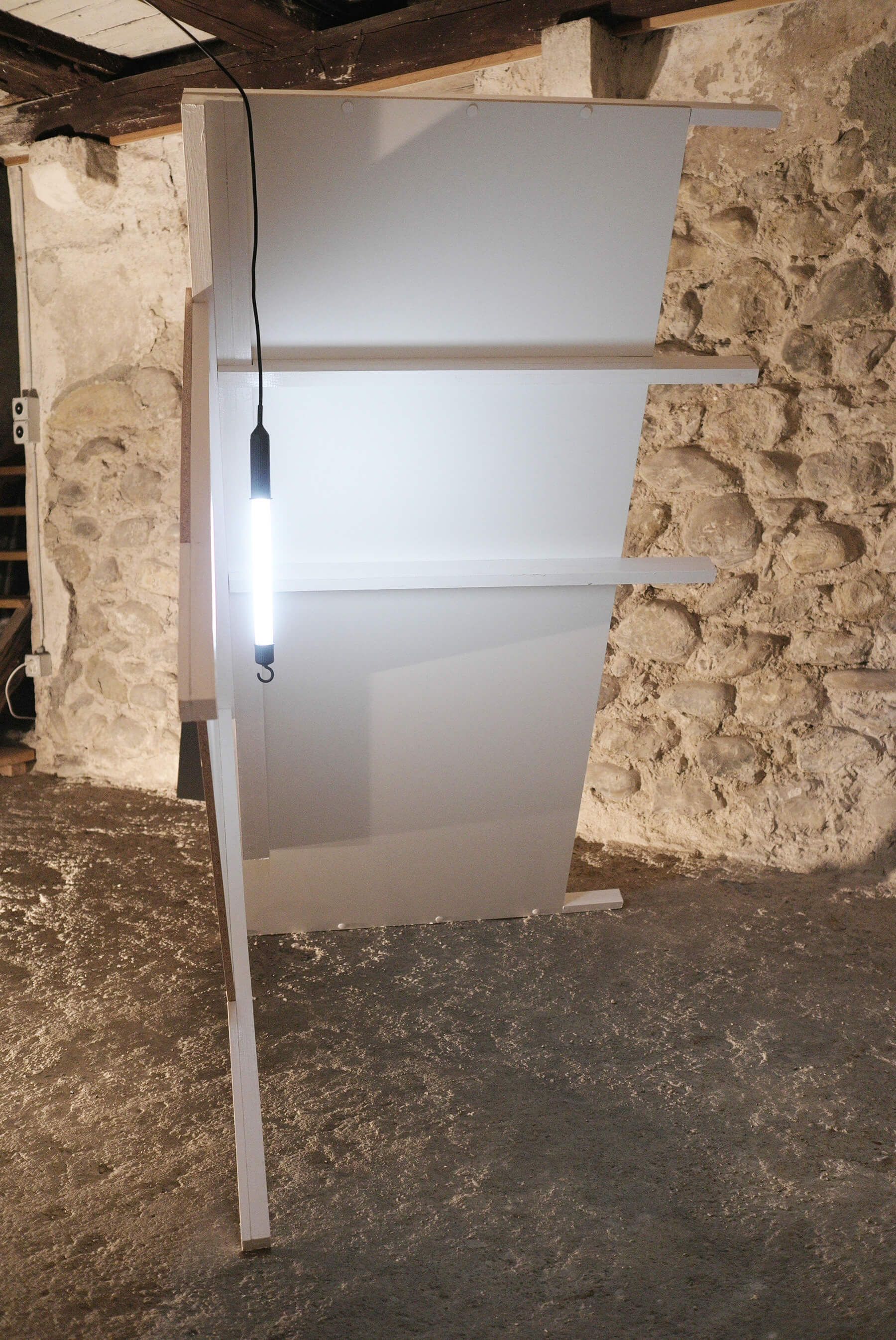 placing-5 sind Abstraktionen von baulichen, architektonischen Strukturen aus meiner räumlichen Umgebung, genauer, meinem Atelierinnenraum, der sich damals in einem Container Mitten in Zürich befand. Diese Umsetzungen ergeben modulare Fragmente, die in den Ausstellungsraum des Kunstbauhofs mit seiner mittelalterlichen Bausubstanz transformiert werden. Im Zentrum stehen eine Verortung, die damit verbundenen Bezugspunkte und deren räumliche Darstellung. Zudem war an der Ausstellung "sklep 61" die Arbeit Brocken5 /Prints zu sehen.